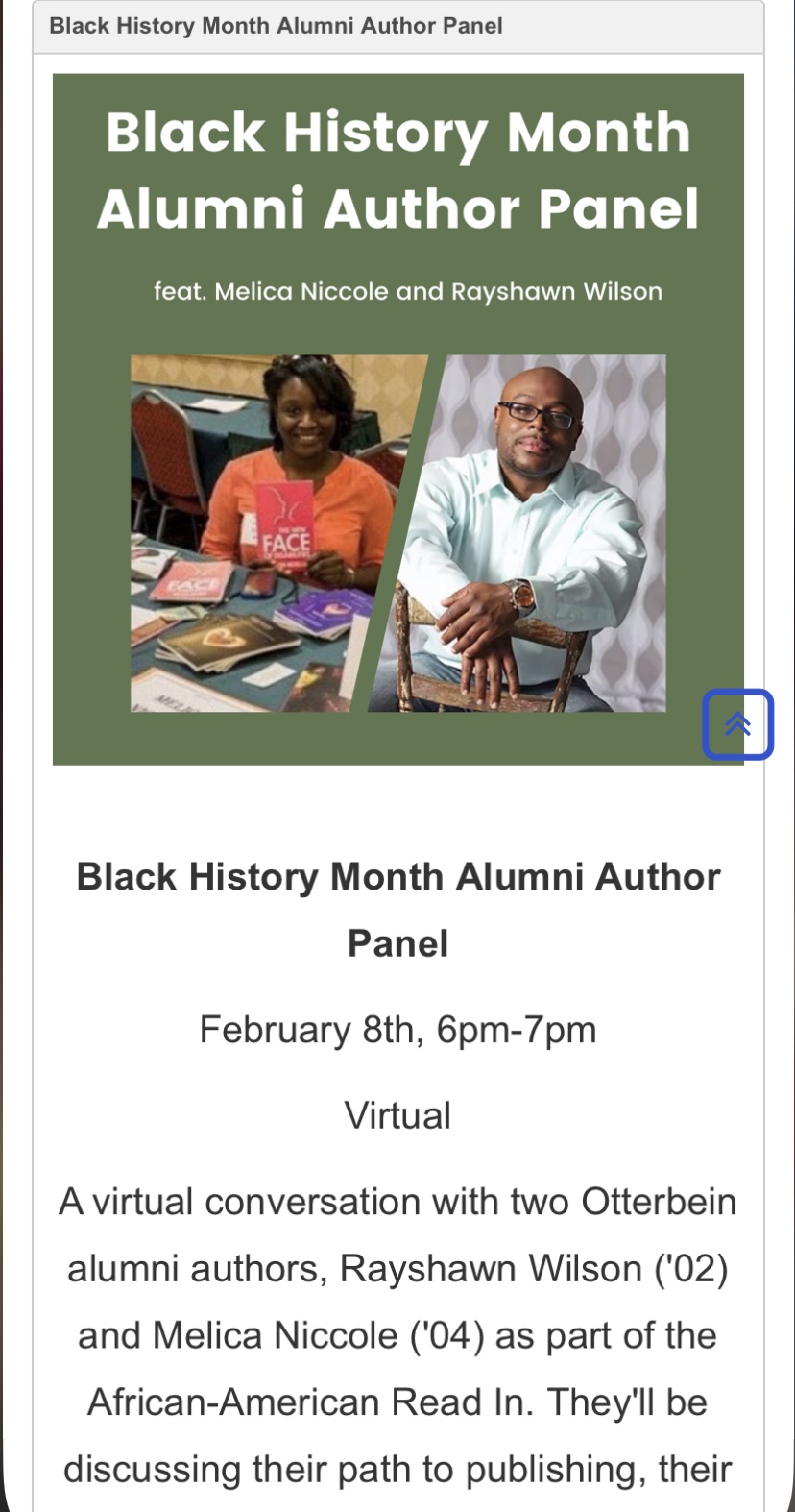 A virtual conversation with two Otterbein alumni authors, Rayshawn Wilson (’02) and Melica Niccole (’04) as part of the African-American Read In. They’ll be discussing their path to publishing, their inspiration, and more. #FYS #INST and #cardsSTANDtogether approved.