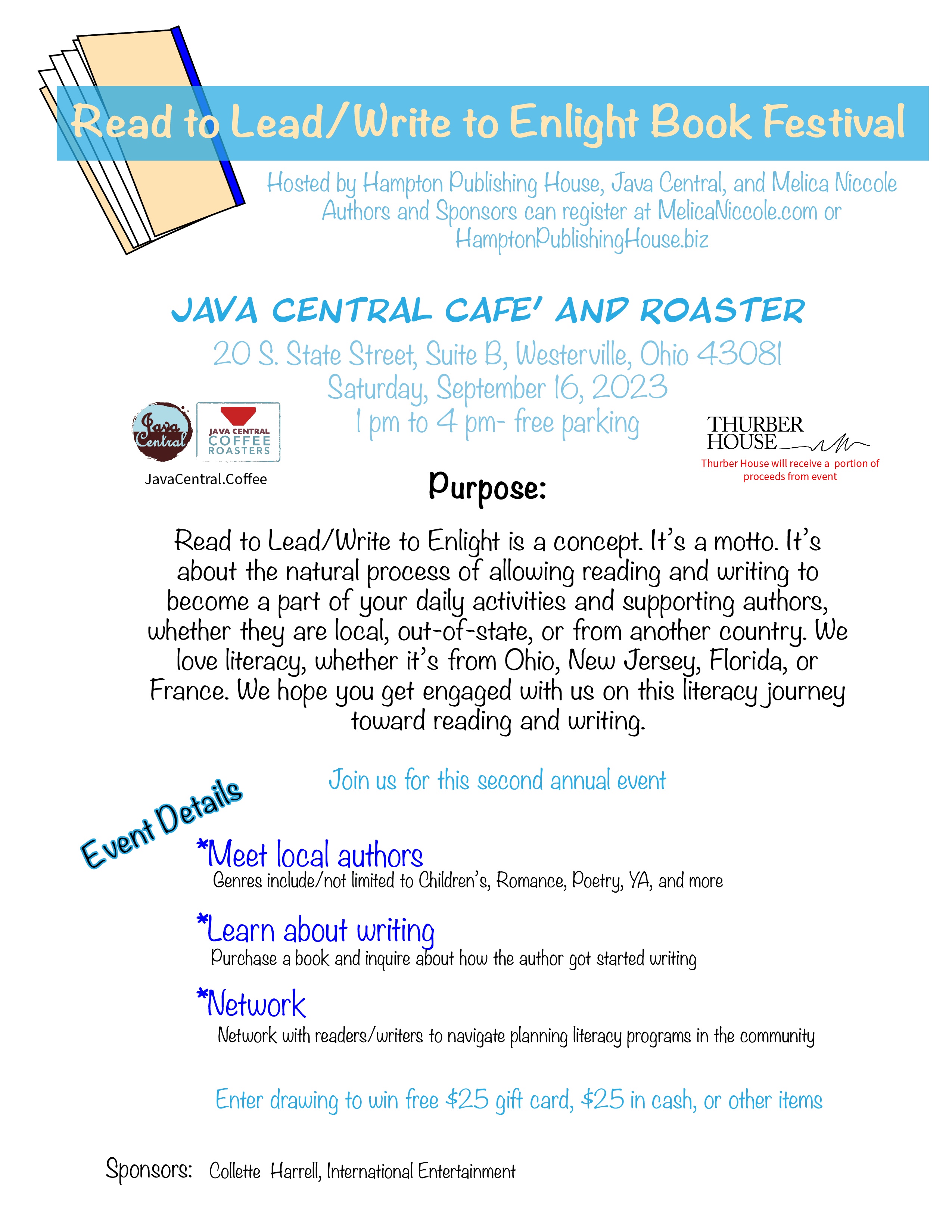 Read to Lead/Write to Enlight is a concept. It’s a motto. It’s about the natural process of allowing reading and writing to become a part of your daily activities and supporting authors, whether they are local, out-of-state, or from another country. We love literacy, whether it’s from Ohio, New Jersey, Florida, or France. We hope you get engaged with us on this literacy journey toward reading, leading, writing. and enlightening.
