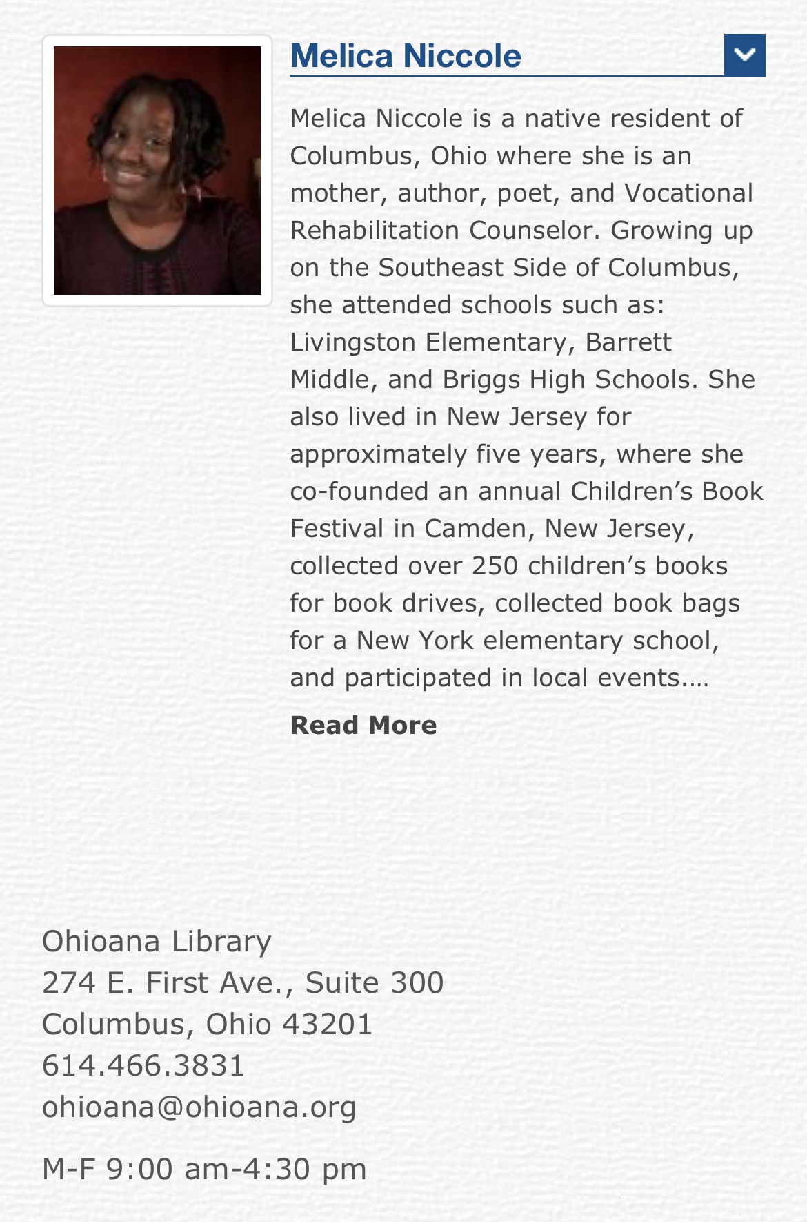 Feel free to check out my author profile here: http://www.ohioana.org/authors/author-profiles/?cn-s=niccole&cn-cat=