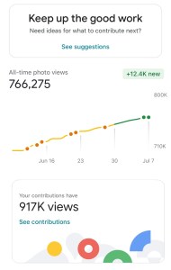 Now this next site, I started to focus on the number of views and postings last year. I attended a seminar, which a presenter identified he had received gifts from companies for posting reviews. So I decided to continue my reviews which I started about 10 years ago. With Google Reviews I have received 766,275 all-time photo views and 917,000 contribution views. My goal is 1 million views by July 31, 2025. Google Reviews: (https://maps.app.goo.gl/SsLPENUtuzZ7scPA7?g_st=ic)
